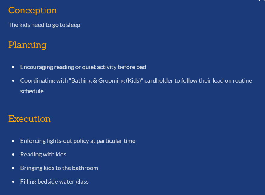 - Execution (e.g. go shopping before food runs out, find preferred items, unpack, put away)